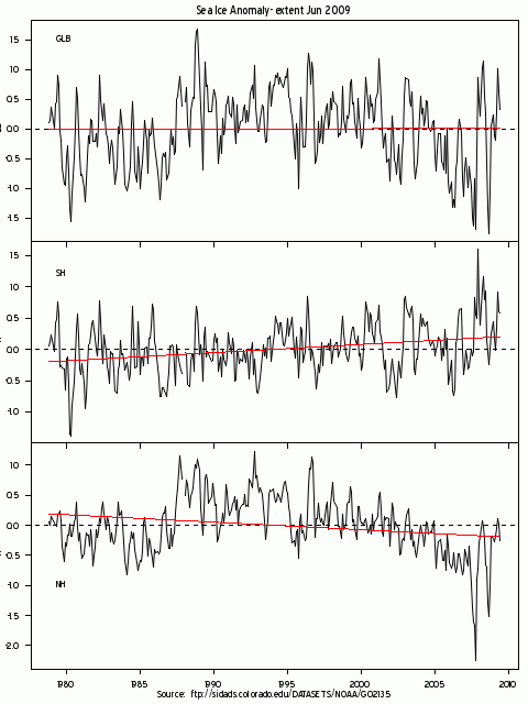 The global sea ice anomaly in June 2009 remained positive. Over the 1979-2009 period, there is zero trend in global sea ice anomaly, with a SH increasing trend offsetting a NH decreasing trend. June 2009 NH anomaly was not remarkable.