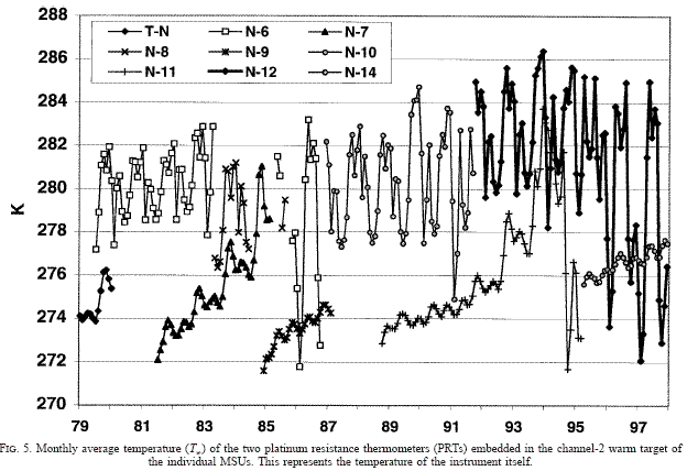 At this point, I’m simply plotting results using a relevant algorithm as an exploratory analysis and am not asserting that any of the breakpoints are “Significant”. Having said that, the breakpoints (which have CIs attached to them) plausibly relate to the (first) termination of NOAA-6 (1983-11), NOAA-10 (1988-10), NOAA-12 (1998-12) and the introduction of AMSU units (2004-12). Here is one more interesting graphic from Christy et al 2000 showing the differences between instrument temperature for different satellites up to 2000 – something that has to be adjusted for. Could errors of 0.2 deg C arise in this standardization? Seems possible to me. Could three errors all be of the same sign? Sure, they could.