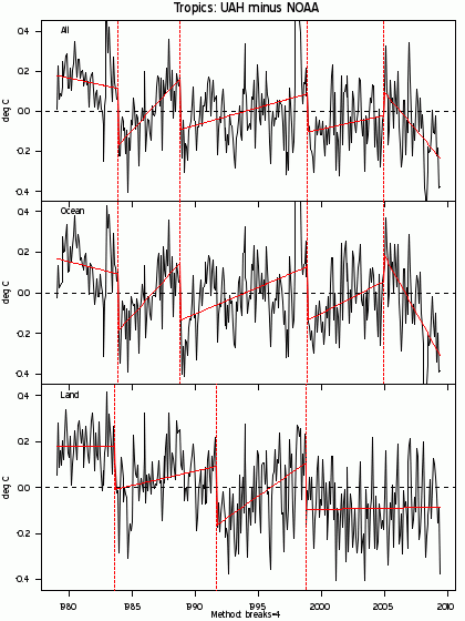 However, suppose that the breakpoints analysis has identified real breakpoints at important satellite transitions. Is it possible that three inter-satellite adjustments were each off by 0.2 deg C or so (and all in the same direction)? I don’t know enough about the inter-satellite adjustment procedures to comment on this, but my quick perusal of the literature hardly leads me to exclude that possibility.