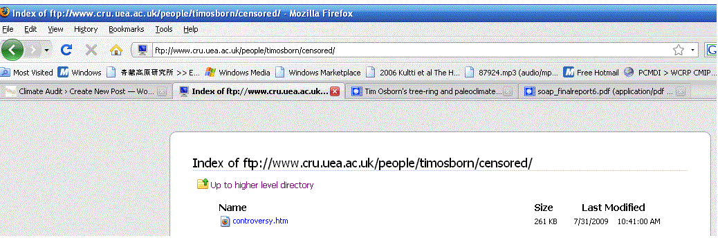On July 31, 2009 at 10:41 am, Tim Osborn published a webpage entitled “controversy.htm”. It is located in a folder entitled ftp://www.cru.uea.ac.uk/people/timosborn/censored/ and the webpage ftp://www.cru.uea.ac.uk/people/timosborn/censored/controversy.htm itself is of course censored. [Update: Later on July 31, Tim Osborn, obviously a faithful Climate Audit reader, censored the censored folder and even the existence of the censored folder (and the controversy webpage) is now censored.]
