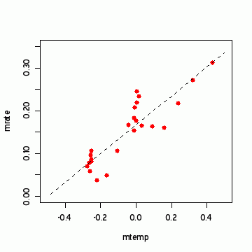 Re: Earle Williams (#1), Yes, I think that could make it even clearer, but what Steve has displayed here is scientifically chilling and pretty obvious. It seems to me that it is is more than likely that they’ve played with these figures until they got a way to make the figures “fit” better, while forgetting about autocorrelation. Hard to believe, but it does seem to be the obvious explanation for these bizarre “relationships”. Copenhagen, here we come with the “relationship”!