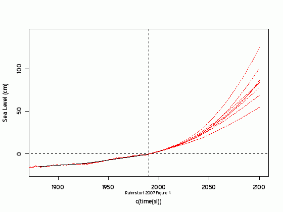 Rahmstorf then takes various IPCC projections and uses the R07 “relationship” between temperature and sea level to project sea level.