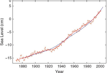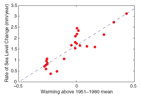 A highly significant correlation of global temperature and the rate of sea-level rise is found (r = 0.88, P = 1.6 × 10−8) (Fig. 2) with a slope of a = 3.4 mm/year per °C.