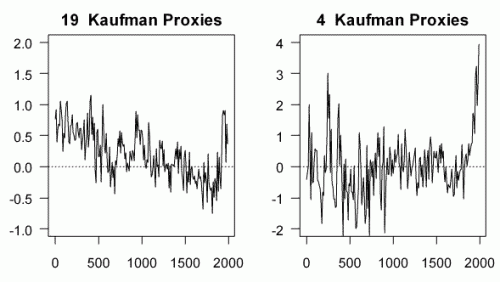 Figure 1. Left – composite of 19 Kaufman proxies; right – composite of 4 Kaufman proxies. (The three Finnish sediments are used in native orientation, rather than the Kaufman orientation, which is inverted from the original orientation e.g. the Tiljander series discussed in the previous post.)
