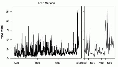 Given the visual appearance of a non-normal distribution, I did a qqnorm plot of all the varve width data (left panel) and, on the right, a similar plot for the logged varve widths. (Loso’s temperature reconstruction is log-transform of his varve width chronology.) As you can see, the original varve widths are remarkably fat-tailed; indeed, even the log-transformed varve widths are far from normal and remain fat-tailed. This creates major complications for simplistic efforts to average a few measurements in making a varve chronology or to “standardize” data as we shall see below. The combination of wildly non-normal fat tails and probable inhomogeneity makes this a very problematic raw material for construction of a temperature index, as I’ll further show below.
