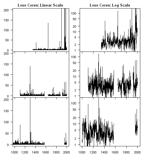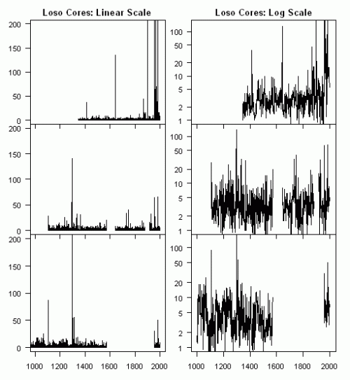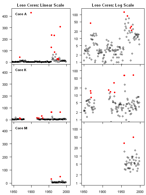 I examined the calculation of the “average” varve thickness from 1860 to 2000 and identified excluded varves (by figuring out which varves, if any, were excluded in order to yield the reported average as opposed to the average using all the varves.) In the figure below, I’ve plotted varve widths for the 3 cores from 1860-2000 in both linear and log scales, marking the excluded varves in red. Loso says that “sediment structure” rather than thickness was the basis for exclusion, but one can’t help but wonder how solid this classification really is. Regardless, the high values in Core A clearly result from some sort of inhomogeneity in the Core A data starting around 1957-8 – and seemingly settling down in more recent values. If this data was revisited in a few years, I wonder whether it would have reverted back to a more average value.