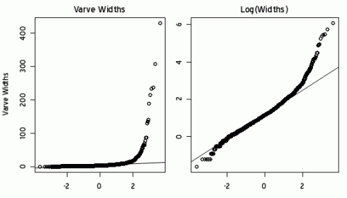 Figure 4. QQnorm plots for varve thicknesses and logged varve thicknesses.