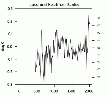 Figure 2. Loso Iceberg Lake series in Kaufman version (left scale: Loso deg C; right scale – Kaufman -SD Units).