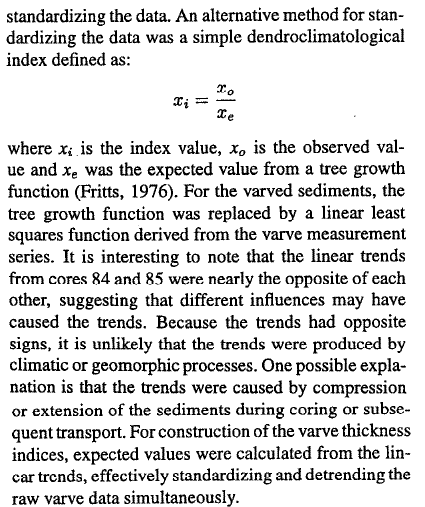 I presume that varve distributions for the other sites (with far more incomplete archives than Loso) have similarly problematic distributions and this is one of the reasons for the quirky handling. All in all, we see at least 4 distinct methods (before turbidite adjustment): linear; log of varve thickness; log of varve mass flux; detrended linear. I suspect that there are further differentiae beneath the surface.