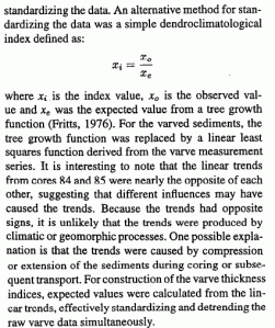 6. Lake C2, Ellesmere Island. This is an old 1996 data set (not collected in the ARCUS2K program) for which there is no archive (Bradley of MBH was a co-author; Bradley assured the House Energy and Commerce Committee that he had archived all his data, but I guess that he forgot about Lake C2.) [Update: sept 23 3.20 pm: Scott Lamoureux of Queen’s University near Toronto has just emailed me the C2 annual data, noting that it had originally been archived with NCDC and been inadvertently removed at some point, a situation he is now redressing. I’ve posted the data up at CA/data/kaufman/C2_annual.dat.] They made a varvochronology explicitly borrowing from tree ring methods by first “standardizing” the data against their “expected” values, which, in this case, appear to be by dividing the varve width by the linear trend. Bradley observes that one trend goes up and one goes down – an inconsistency that didn’t seem to bother anyone at the time, nor seemingly Kaufman in its present iteration. (Without original data, it is of course impossible to determine exactly what they did.) No mention of Cs137, Pb210 or C14 cross-dating. (Lamoureux and Bradley 1996; Hardy et al 1996)