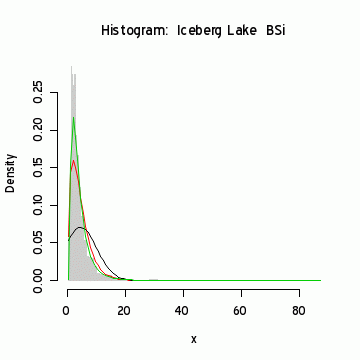Taking a simple average from this sorts of weird distributions (as is done in most of these recons) doesn’t seem like a very diligent way of handling the non-normality. While the functional form of the Hallet Lake BSi flux series is not very attractive, one can sense the underlying motive for trying to do something to coerce the data into a comparison with temperature.