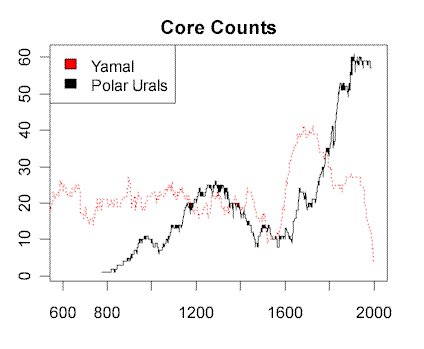 To show the tininess of the subset representing Yamal in the 1990s, the next graphic compares Yamal counts with counts from the Polar Urals version, set aside by Briffa in favor of the Yamal series (and even I’m a little shocked by the discrepancy). In 1990, there were 57 cores in the Polar Urals and only 10(!) in the Yamal subset.