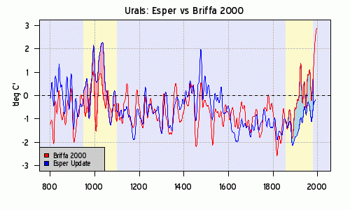Figure 1. Comparison of the (smoothed) Yamal reconstruction (Briffa 2000, Briffa et al 2008, Kaufman et al 2009 and many others) to the Polar Urals Update (Esper et al 2002).