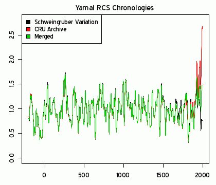 Sure enough, there was a Schweingruber series that fell squarely within the Yamal area – indeed on the first named Khadyta River – russ035w located at 67 12N 69 50Eurl . This data set had 34 cores, nearly 3 times more than the 12 cores selected into the CRU archive. Regardless of the principles for the selection of the 12 CRU cores, one would certainly hope to obtain a similar-looking RCS chronology using the Schweingruber population for living trees in lieu of the selection by CRU (or whoever).