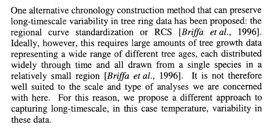 Unfortunately the RCS approach is far from being a general panacea for the loss of long-timescale information in dendroclimatology. …