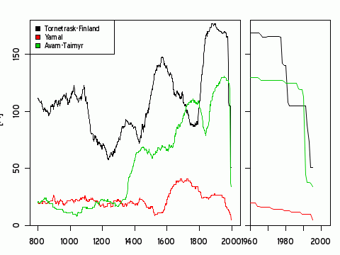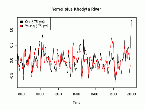 The two graphics below compares chronologies for old (more than 75 years) and young (less than 75 years) for the combined Yamal and Khadayta River data sets. The first shows them for the period from 1800 to the present. As you see, up to the 1970s, the young tree chronology is, shall we say, remarkably similar to the old tree chronology. Thus, if we stipulate along with Gavin and his guru that the young tree chronology is simply “noise”, a similar characterization also applies to the remarkably similar old tree chronology. The most distinctive feature of this graphic is something quite different than the guru reported to us: given the similarity of the two series up to 1970, their divergence thereafter really is quite remarkable. Readers should not presume that it is the young tree chronology that is the exception. Tomorrow I’ll show this with a graphic comparing these two series to the NSIB temperature reconstruction of Briffa et al 2001.