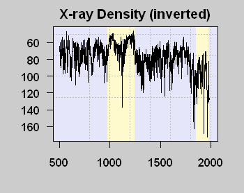 In a more mundane version, the figures below (from CA in fall 2008) show the Xray density series shown above in the upside down Mann orientation together with another upside down Tiljander series.