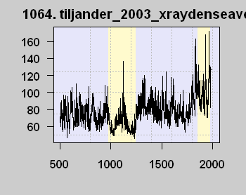 Here is a figure from Tiljander et al showing the density graphic, rotated so that up corresponds to warm periods.