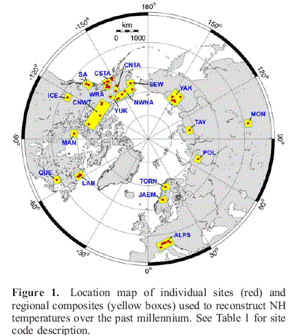 Figure 2. NAS Panel Figure 4-1. Original Caption: Location map of individual sites (red) and regional composites (yellow boxes) used to reconstruct Northern Hemisphere surface temperatures for the past millennium. SOURCE: D’Arrigo et al. (2006).