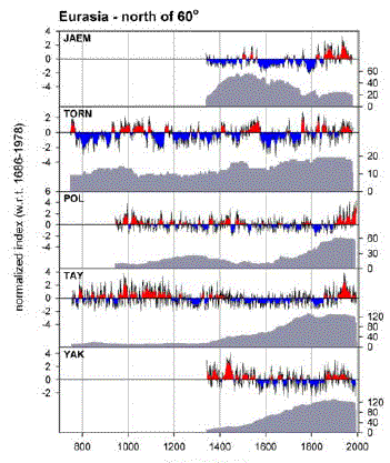 Figure 1. Excerpt from NAS Panel Figure 4-2. Original Caption: Results for individual regional composite chronologies for the sites shown in Figure 4-1. The time series have been loosely grouped according to latitude bands and normalized to the common period. The bottom two panels in the right column show grouped replication plots for both North America and Eurasia. SOURCE: D’Arrigo et al. (2006).