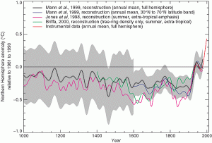 There are a couple that are a bit sui generis, but these unfailingly have some serious problem. Jones et al 1998 uses neither Yamal nor bristlecones, but still has a slight modern-medieval differential. In its early portion, it uses only three series, two of which are early Briffa series (Tornetrask and Polar Urals pre-update). Both these series have serious problems – Briffa’s original Tornetrask series contains a gross manual adjustment to increase the 20th century relative to the MWP. See early CA posts on this.