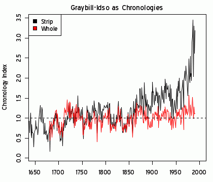 First, here is the original graphic from Graybill and Idso, showing the difference between strip bark and whole bark chronologies at Sheep Mt.