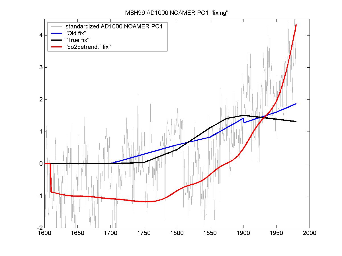 After establishing this, I had another surprise. I noticed that there is also a file “pc1-fixed-old.dat“, which I presumed to be the output of “co2detrend.f”. Well, it turned out that the “fix” contained in the file was neither of the methods described so far. Thus Mann had at least three methods for “adjusting” his PC1! Here is a plot of different “fixes” (to be subtracted from the original PC1) uncovered so far.