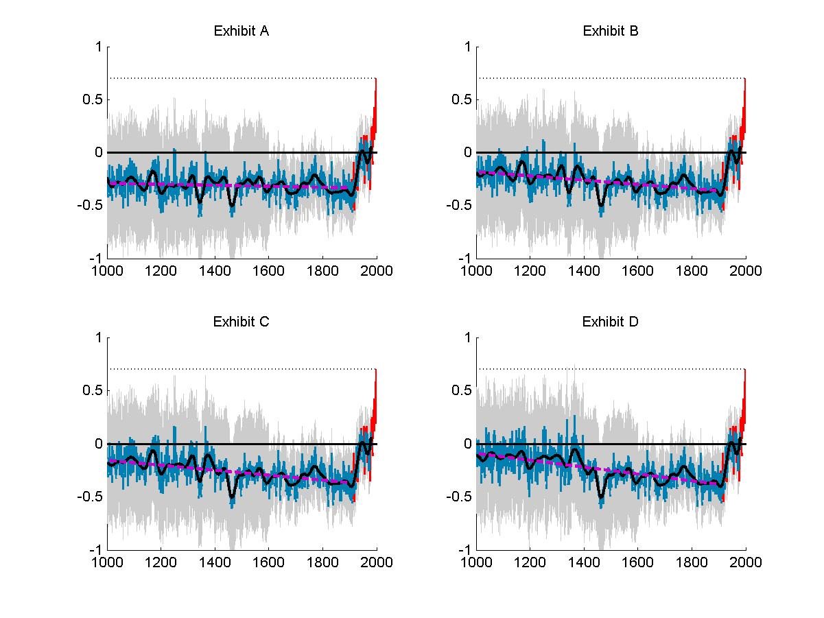 Finally, the answer to the question posed in the beginning. The original Hockey Stick is Exhibit B. Exhibit C is obtained using the “old” AD1000 NOAMER PC1 “fix” keeping everything else the same in the Mannomatic. Exhibit D corresponds to the “co2detrend.f fix” , and Exhibit A is obtained using the original Mannian PC1 (no fixing). (click below to see an animated GIF of the different versions)