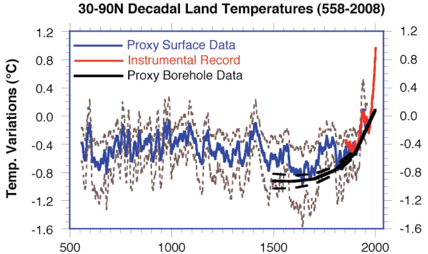 Boulton Figure 3 Caption: Estimates of mean decadal temperatures over the land areas between 300 and 900 in the northern hemisphere during the last 1500 years. Prior to the instrumental record of the last 150 years (shown in red), temperatures are deduced from tree-rings, lake sediments and ice cores. The dashed lines show the range of higher frequency variability in the data. The record shows an early mediaeval cool period from prior to about 950AD, a mediaeval warm period until about 1200AD, the so-called Little Ice Age from about 1450 to 1850AD and the very strong late 20th Century warming. Temperatures in sub-surface rocks can be used to deduce long-termchanges in surface temperature that naturally smooth out inter-annual variations to show long-term trends. Temperature records from 631 boreholes have been used in this way to show how distinctive the 20th Century warming has been compared with the preceding 400 years. (From: Hegerl, G.C. and others. 2007. Detection of human influences on a new, validated 1500-year temperature reconstruction; Journal of Climate, 20 (4): 650-666.)