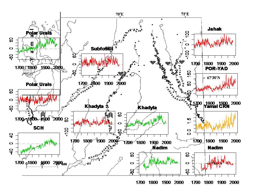 Figure 1. Inset chronologies on H-S location map. For the purposes of this map, I’ve done the chronologies by making a age-curve from the entire population of subfossil cores in the Climategate documents and developing a chronology for each site from the residuals for this standard fit (taking one size fits all to a regional scale). Red – slarch; green – spruce. The original Yamal chronology (modern portion) is also shown.