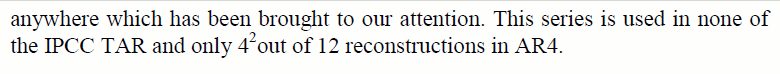 The point at issue here is obviously medieval-modern comparisons. Only 8 of the 12 AR4 reconstructions provide such a comparison (Oerlemanns’ glacier recession; Pollack and Smerdon’s borehole; Rutherford et al 2005 and Briffa et al 2001 go back only to 1500 or 1400.) Using a denominator of 12 rather than 8 for the comparison is what climate scientists call a “trick”.