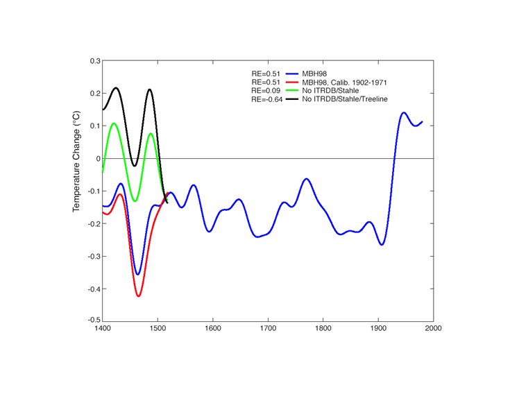 But you cannot choose what data to use, simply by the beneficial effect it might have on the reconstruction statistics! It might be nice for Mann to include Gaspe for these reasons, but MM reasons for excluding it include (a) zero trees in sample for years 1400-1404; (b) just one tree in sample for 1404-1421; (c) just two trees in the sample for 1422-1447; (d) “the authors who originally sampled the Gaspe data don’t use any of the data before AD1600”. (Source: McKitrick’s “What is the hockey stick debate about?” presentation – link at top left, under “Favourite posts”.)