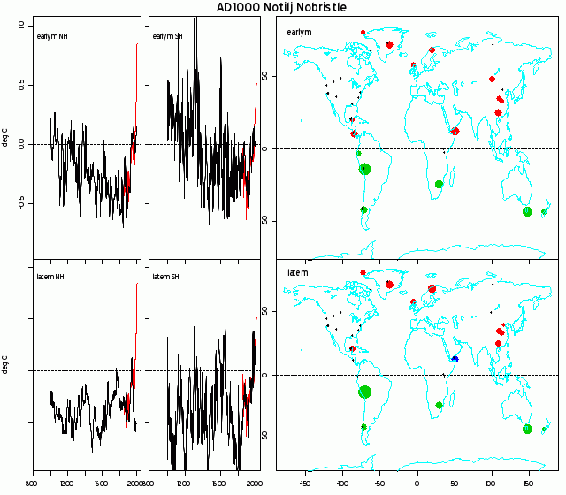 1) Going from earlym to latem, both NH and SH switch from a cooling trend from 900 AD to 1700 AD to a flat relation. This makes no sense and indicates a problem.