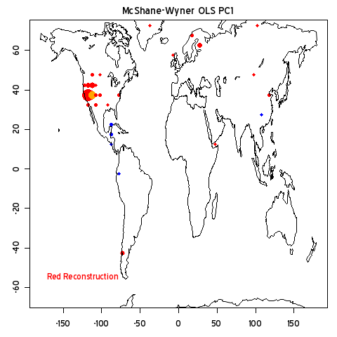In the following graphic, I’ve indicated the weights of individual gridcells by the weights of the filled circle – a technique used here on a number of occasions. After all the huffing and puffing of megaflops of multivariate analysis, it all comes down to a vector of linear weights of the original proxies (in calculating the weights, I’ve used linear algebra shown at CA in the past.) Other permutations are less weighted towards bristlecones.
