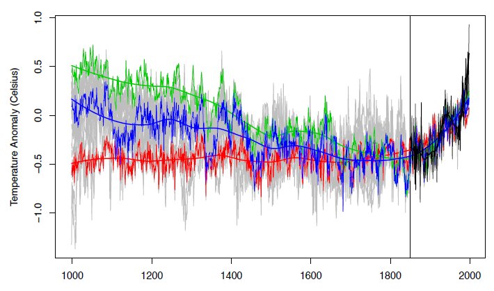 Green and blue are reconstructions from using other model building methods taht have verification metrics that are just as good as the famous red one from Mann et al. I thought that this was M&W’s main point. They showed that because of the short instrumental period and noisy proxies that different methods produced wildly different reconstructions. There was no way to choose between these reconstructions even though they had very disparate properties/