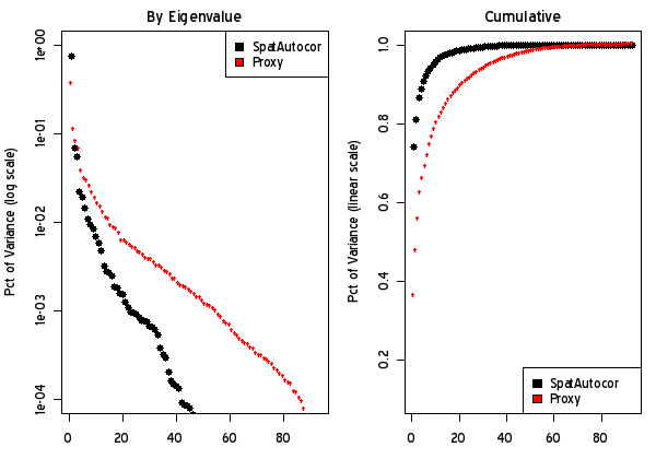 Next, here is an interesting comparison of the eigenvalues for spatially autocorrelated red noise at actual proxy locations and for the actual M08 (MW93) proxy network. On the left is a “scree” plot showing the squared eigenvalues (log scale) for the actual proxy network as compared to spatially autocorrelated red noise. Gavin Schmidt has an eigenvalue comparison in the Schmidt et al comment on Mc_W, but does not consider the potential impact of non-random spatial distribution of proxy locations. On the right is the cumulative eigenvalue weights.