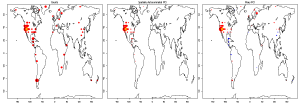 I’ve done three plots below showing weights in the style that I’ve been using – the area of the filled circle proportional to the weight. Red for positive weights, blue for negative weights. (I’ve plotted the gridcell beside Sheep Mountain in orange to avoid it being overprinted by the Sheep Mountain gridcell – there’s no significance to the orange otherwise.) In each case, I’ve added up weights in a gridcell and plotted values by gridcell. Click on the plot below for a larger version.