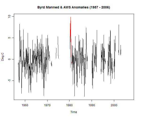 On top of that, O’Donnell et al. do not appear to have used all of the information available from the weather stations. Byrd is actually composed of two different records, the occupied Byrd Station, which stops in 1980, and the Byrd AWS station which has episodically recorded temperatures at Byrd since then. O’Donnell et al. treat these as two independent data sets, and because their calculations (like ours) remove the mean of each record, O’Donnell et al. have removed information that might be rather important. namely, that the average temperatures in the AWS record (post 1980) are warmer — by about 1 Deg C — than the pre-1980 manned weather station record.