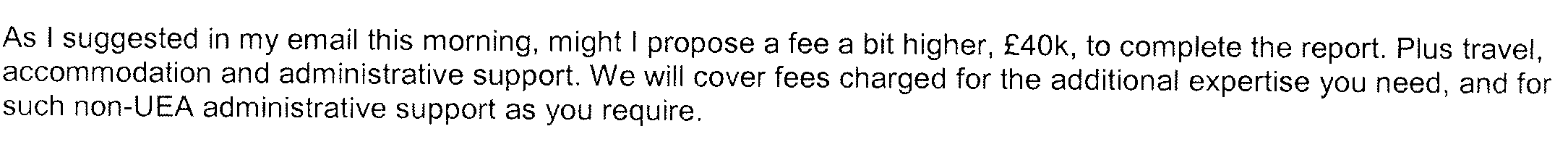 “The attached file contained a summary of the agreement between Acton and Muir Russell, including a suggestion from Acton that Russell’s fee be “a bit higher, £40,000”