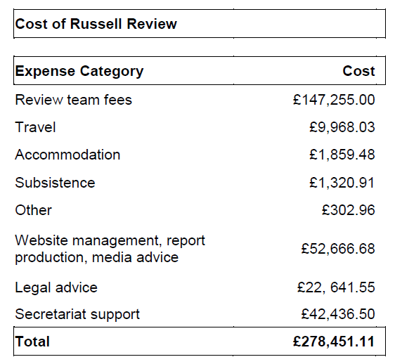 Impressive. I have managed many consultancies on behalf of government bodies, and would never be able to get away with a document like this as an explanation of where the money went. Where is the breakdown of the fees paid to members of the inquiry? What on earth did they spend over 50 grand on under the ‘website management, report production and media advice’ heading?