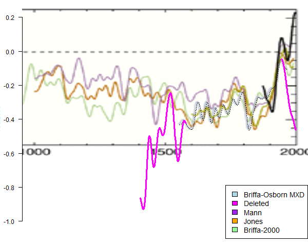 So why were pre-1550 values shown in Briffa et al 2001 and not in Briffa and Osborn 1999? The only reason that I can deduce is that the Briffa 2001 reconstruction had a rhetorical similarity to the Mann and Jones reconstructions in the 1400-1550 period – and therefore was shown, while the Briffa and Osborn 1999 version showed a major discrepancy – and was therefore not shown.