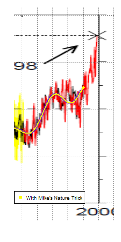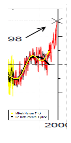 Mike’s Nature trick doesn’t hide a decline, it artifically creates an incline at the end. Given that the incline’s relative size is what is so important for the hockey stick graphs, this is the worse feature.