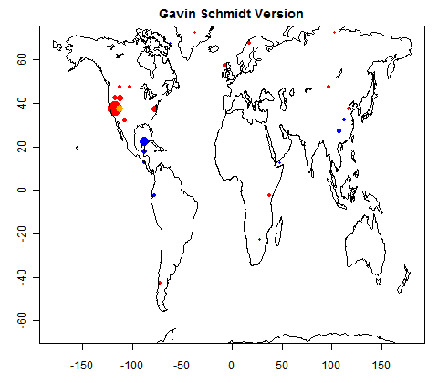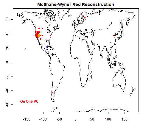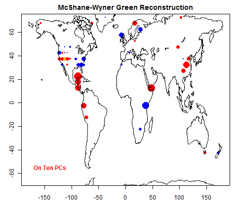 Because one can assign a vector of weights, it’s possible to make highly informative maps showing the weights of proxies by the size of the disk at the proxy location, designating the sign by a different color. Unfortunately, this sensible practice of examining proxy weights has not been adopted by paleos. Their failure to show proxy weights inevitably leads to quite a bit of (in my opinion) aimless thrashing, with the Smith paper being a recent example.