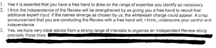 I think the best indication of just how independent the Russell Review was and just who was running it, can be seen in the 15 April 210 email from Boulton to Lisa Williams. This is one of the emails in: