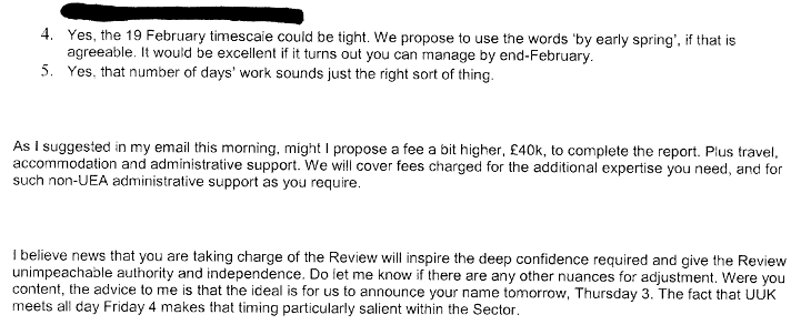 “As I suggested in my email this morning, might I propose a fee a bit higher, £40k, to complete the report. Plus travel, accommodation and administrative support. We will cover fees charged for the additional expertise you need, and for such non-UEA administrative support as you require.”