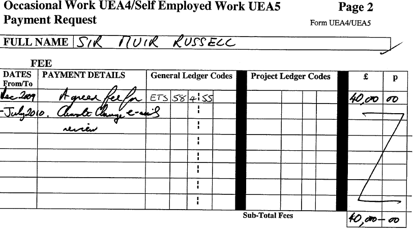 Remember how the University said that it “does not consider that there was a contractual relationship with Sir Muir Russell or the inquiry team”. However, when it came to collecting his ₤40,000 from the University, Muir Russell had no doubt whatever of the existence of an agreement between him and the university that he should get paid ₤40,000. Muir Russell signed and submitted a UEA Form4/5 for Occasional Work/Self-Employed Work referring in his own handwriting to an “agreed fee” with the University (see here):