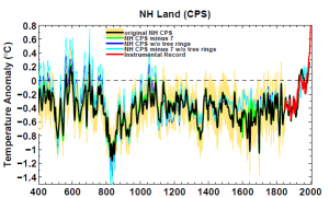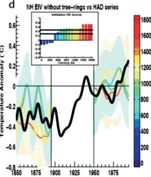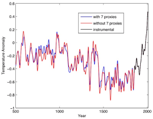 Oh. The hockey stick you get when you don’t use tree-rings at all (blue curve)?