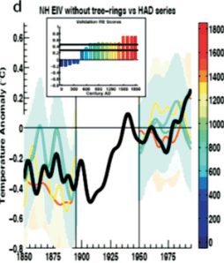 It doesn’t. Even if the error didn’t have a material impact on the results, a Corrigendum should have been issued. Kaufman et al 2009, for example, issued a corrigendum when they learned that they too had used data (including their Tiljander series) upside down. But the situation for Mann et al 2008 is quite different. The most prominent claim for Mann et al 2008 was its supposed achievement of a “skillful” reconstruction without tree rings for the past 1300 years. Unfortunately, this “achievement” can now be seen to have been a complete mirage, dependent on the use of contaminated data in the EIV reconstruction without tree rings.