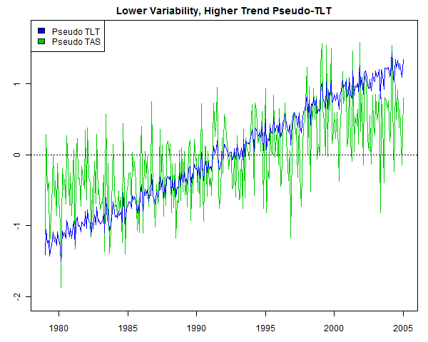 As discussed in comments, this is not the correct approach to the problem. The correct approach was the straightforward one said to have been used: the ratio of the trends. This can be seen in the diagram shown below where the blue (“pseudo-TLT”) series goes up at a higher trend (0.1 units/year) than the green (“pseudo-TAS”) series (0.05 units/year) – an “amplification factor” of 2, but has a lower variability (both have the same rnorm error, but the blue series has an amplitude of 0.25 of the green series).