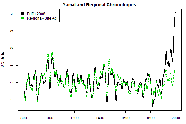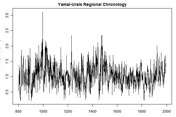 The next figure shows a Yamals-Urals regional chronology (script shown in first comment). In this figure, I’ve calculated the chronology after allowing for inter-site differences. If inter-site differences are ignored, a “method” potentially used in other Briffa et al 2008 regions, 20th century levels are a little higher but not exceptional. (I’ll post up an attachment showing the differences.)